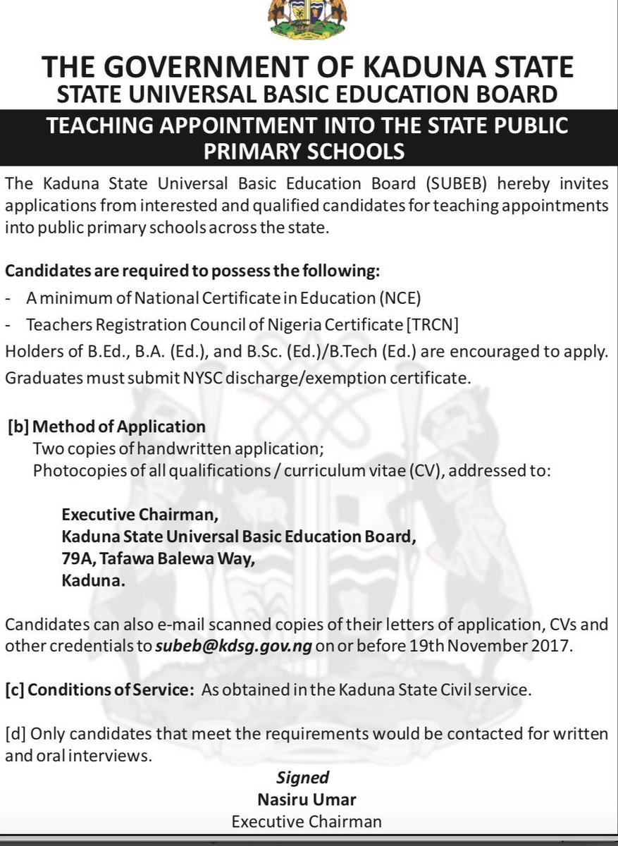 Kaduna State Government is inviting applications from qualified and interested graduates for teaching appointments into public primary schools. Those who failed the primary 4 competency test have a second chance to reapply if they believe they’re qualified.